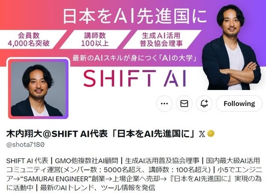 「日本をAI先進国に」を掲げAIのビジネス活用を学べるAIコミュニティ「SHIFT AI」URL:https://lp.shift-ai.co.jp