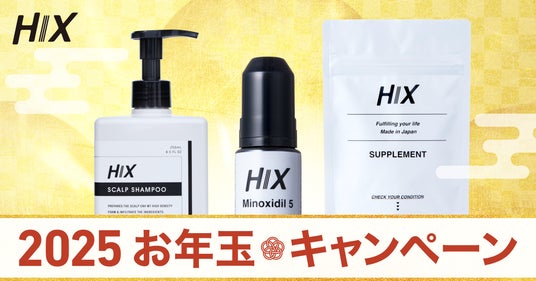 AGAセルフケアブランド「HIX」は、ご利用いただいているユーザーのみなさんへの感謝の気持ちを込めて、また、2025年新たにヘアケア・AGA対策を取り入れていただける方の後押しになるよう、HIXお年玉キャンペーン2025を実施予定です。