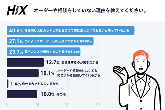 - 相談をしない理由最多は「毎回同じ人にカットしてもらっているから」次いで「どのようにオーダーしたら良いかわからないから」、「薄毛のことを相談するのは恥ずかしいから」
