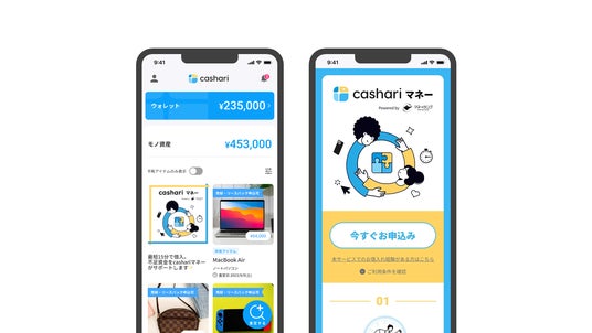 「cashariマネー」は、モノ資産の管理・活用アプリ「cashari」内で提供される、GeNiEによる貸付サービスです。1,000円から借入可能で、借入の申し込みから審査完了までは最短15分。「cashari」でモノ資産を資金化するだけでなく、「cashariマネー」を通じ資金調達することも可能になります。