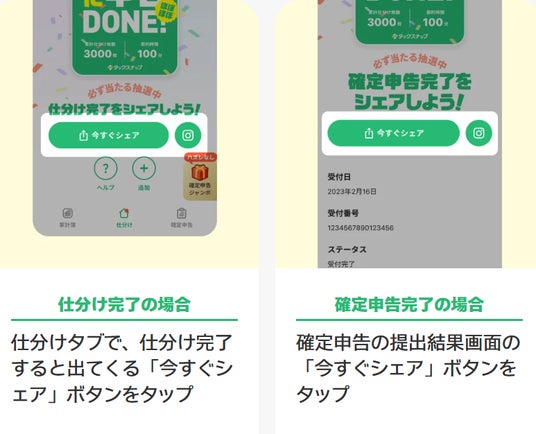 このキャンペーンは、「仕分け ※」の作業もしくは「確定申告」をアプリ内で完了し、完了画面をSNSでシェアすると、抽選に応募できます。こちらは、仕分けや確定申告を「お先に」終わらせることで余裕を持って確定申告に取り組んでいただくことと、他より一歩先に動く方を称えることを目的としています。また、申告期間前に仕分けなどの準備を済ませることで、安心感や心の余裕を得られるうえ、ご褒美としてプレゼントが当たる楽しみもある内容となっております。