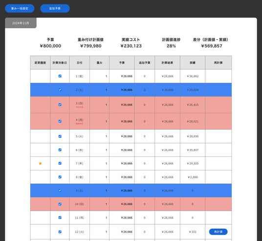 入札や予算関連の変更履歴も日別に紐づけるため、予算変動の要因も確認できます。