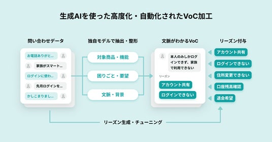 一方、従来のVoC分析ツールでは、キーワードの抽出や簡単な要約にとどまっており、改善策につながる示唆が導き出せず成果を生み出す活用が難しいことや、データ加工と分析に膨大な工数と費用がかかることなどの課題が顕在化しています。