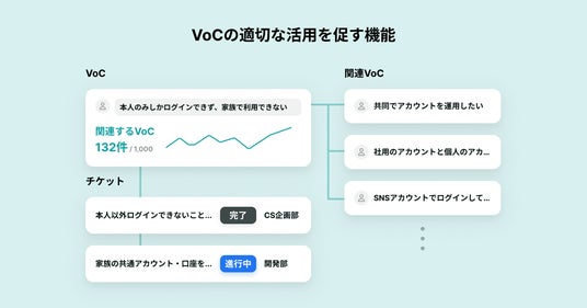 個々のVoCの羅列だけでは導き出せない課題の重要度を、類似の声を自動集計し定量で可視化する「関連VoC機能」や、適切なアクセス権限やタスクごとのアサインやステータスを一元管理ができる「チケット機能」など、CS部門だけではなく全社で活用できる様々な機能を実装しています。