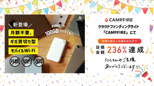 業界最安値のプリペイド式チャージWi-Fi「サクッとWi-Fi」はCAMPFIREで目標236%達成!