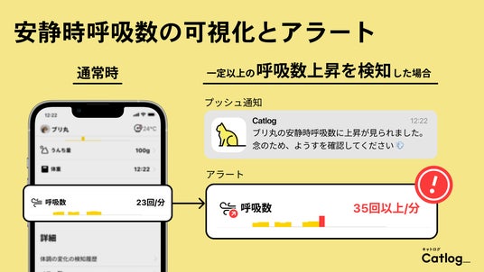株式会社RABO(本社:東京都渋谷区、代表取締役社長:伊豫 愉芸子、以下「RABO」)は、提供する猫様向け首輪型デバイス『Catlog』において、本日12月18日に、猫の安静時の呼吸数の変化から、ストレスや体調不良(発熱、痛み、貧血、呼吸器や循環器の問題)など、普段気づきにくい不調に気付くきっかけとなる「安静時呼吸数」の機能をアップデートしたことをお知らせいたします。このアップデートにより、問題がある可能性が示唆される場合は、アラートにて飼い主さんにお知らせすることが可能となりました。『Catlog』では、以前より安静時の体温変化を時間ごとに表示し、普段より一定以上高い場合はアラートする機能を提供していますが、今回のアップデートも猫様と飼い主さんのQOL・ウェルビーイング向上を目指すRABOが『Catlog』および『Catlog Board』にて行なっているアップデートのひとつとなっており、引き続きすべての猫様、飼い主さんにとって生活の質を向上させるための取り組みを行なってまいります。