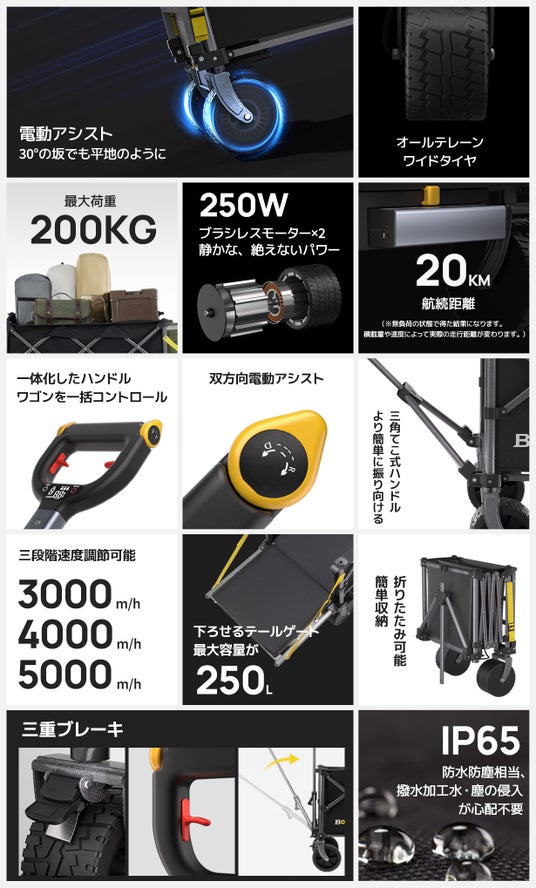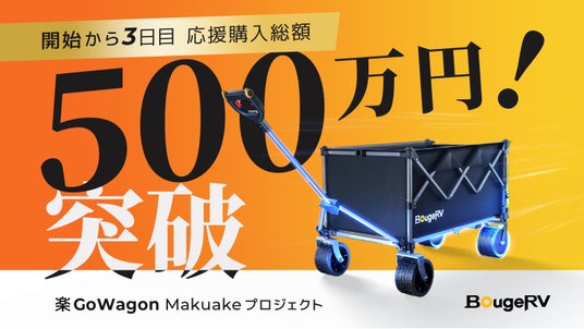 アウトドア生活ソリューションを提供するISSYZONE JAPAN株式会社(本社:東京都台東区、取締役社長:王冲衡、日本語読み:イジーゾン)のブランド、BougeRV(日本語読み:ボージアールブィ)は、電動キャリーワゴン「BougeRV 楽GoWagon」Makuake特別先行販売にて、サポーターの皆様のおかげで、12月16日(月)開始初日すぐに目標を達成し、1時間未満で応援購入総額が100万円を突破いたしました。さらに、開始から3日目(12月18日(水))に、応援購入総額が500万円を越えました。ご応援いただいたサポーターの皆様に心より感謝申し上げます。