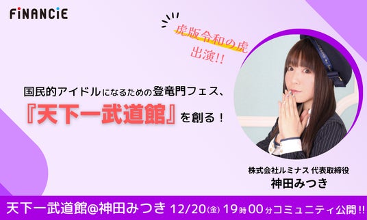 株式会社フィナンシェ(代表取締役:國光 宏尚、以下フィナンシェ)は株式会社ルミナス・代表取締役、神田みつきが運営するコミュニティ「天下一武道館@神田みつき」が、本日12月20日よりコミュニティを公開したことをお知らせいたします。