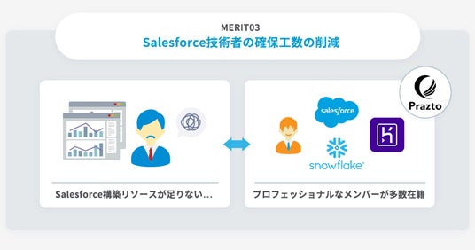 当社は、高度な技術力を持つSalesforce開発者を多数擁しております。需要の高まりにより採用・確保が困難となっているSalesforce技術者について、当社の豊富な技術者リソースを活用いただくことで、パートナー様の人材採用・確保にかかる負担を大幅に軽減いたします。