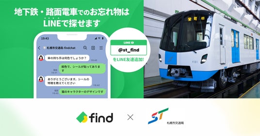 札幌市交通局(北海道札幌市、交通事業管理者:芝井 静男)は、株式会社find(本社:東京都中央区、代表取締役CEO:高島 彬、以下「find」)が提供する「落とし物クラウドfind」を2025年1月6日(月)から導入し、LINEでのお問い合わせを開始します。札幌市交通局が本サービスを導入することにより、札幌市営交通を利用されるお客さまは、地下鉄・路面電車・駅施設等での忘れ物をLINE から 24時間お問い合わせいただけます。また、職員向けの業務用アプリも導入することで、お客さまからの問い合わせ等に対し、よりスムーズな対応が可能となり、忘れ物に関わる職員の業務負担軽減も図られます。
