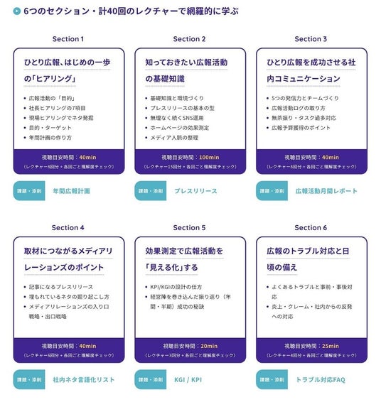 広報に初めて着任した方、これから広報機能を立ち上げたいと考えている方はもちろん、ひとり広報としてより成果を上げたい/組織に貢献し、適切に評価を受けたいというお悩みを持つ方に最適な講座です。実務ですぐに使える各種テンプレートのほか、全6回の各セクションの最後には添削付きの課題をご用意。提出いただいた方には、PR歴8年以上の講師陣が現場目線でフィードバックを行います。