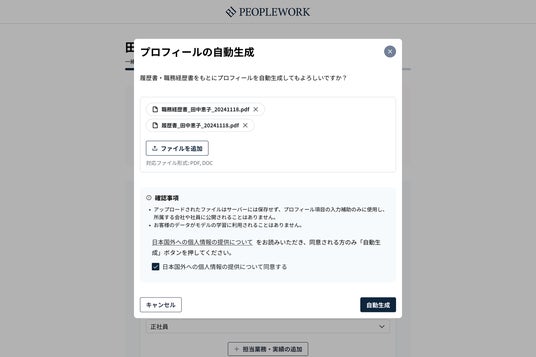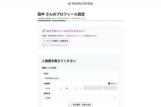 エンプロイーサクセス事業を推進する株式会社PeopleX(本社:東京都渋谷区、 代表取締役CEO:橘 大地、以下:当社)は、当社が提供するエンプロイーサクセスHRプラットフォーム「PeopleWork」に、生成AI・LLM技術を用いて人的資本、人事業務に関連する非構造化データを構造化する技術「Lincoln 1」を開発し、履歴書・職務経歴書から所有スキルを自動で判定する新機能を実装したことをお知らせいたします。