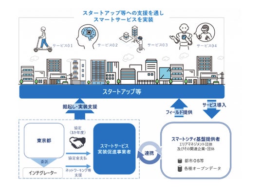 「Be Smart Tokyo プロジェクト」では、「スマート東京」の実現に向けて、スタートアップによるスマートサービスの実装を支援する「スマートサービス実装促進事業者」と連携しながら、都内全域をフィールドにスマートサービス*をスタートアップによってスピーディに実装していくことを目指しています。