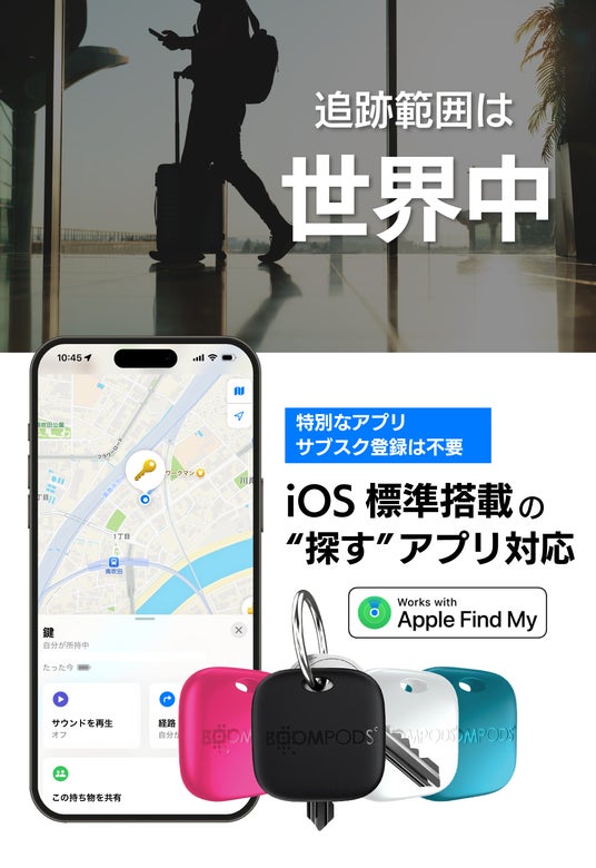 海外でも追跡可能!探す機能対応BOOMTAGは、iOS標準搭載アプリの「探す」に対応しています。その追跡範囲は全世界となり、国内だけでなく海外でも使用することが可能です。
