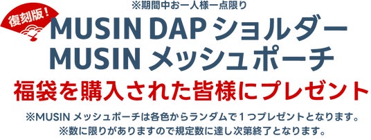 今回福袋をご予約・ご購入頂いた方には、復刻版の「MUSIN DAPショルダー」とカラフルな色が人気の「MUSINメッシュポーチ(ランダム1色)」をプレゼントさせて頂きます。
