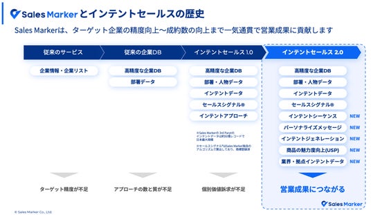 当社はこれまで、Web検索行動データからわかるインテントデータと生成AIを活用した国内初のインテントセールスSaaSとして、Sales Markerを開発・提供してまいりました。サービス提供開始から2年で累計500社を超える企業のインテントセールス実践をご支援する中で、インテントデータを活用したターゲティングリストの精度向上だけでは営業成果に繋がらないケースに直面し、課題解決に向け邁進してまいりました。