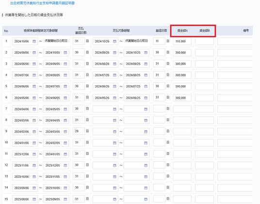 出生時育児休業給付金支給申請書の賃金額を算出する際に、被保険者期間算定対象期間、支払基礎日数、支払対象期間、基礎日数、賃金額A、賃金額Bに対して、定められたルール通りに値を入力する必要があります。
