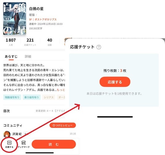 好きな作品を手軽に応援! 1日に3枚配布される応援チケットを使用して、手軽に作品を応援することが可能です。