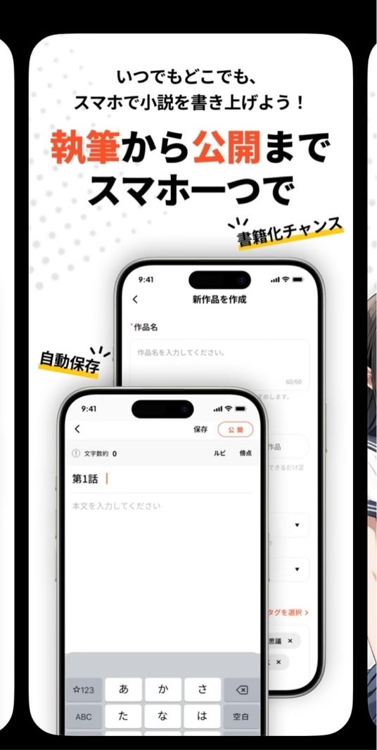 読むだけじゃない、書ける機能も充実 作品を読むだけではなく、執筆するツールも充実しています。作品の進捗はリアルタイムで保存できる機能も完備。書いた作品は即時公開はもちろん、時間を予約して投稿することも可能。いつでもどこでも気軽に小説の執筆を楽しめます。