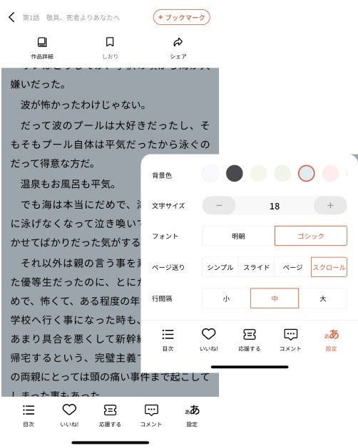 カスタマイズできる読書画面 読書画面はカスタマイズを自在に可能。作品閲覧画面の本文をタップし、右下の「設定」を選択すれば、読書画面をカスタマイズすることができます。文字の大きさ、背景の色、行間などを細かくカスタマイズ可能。