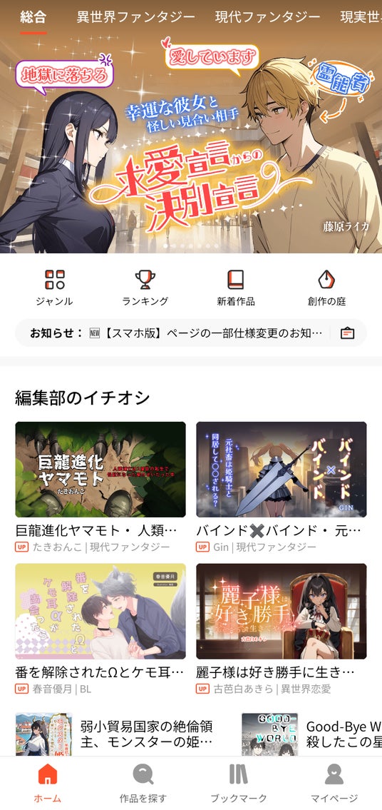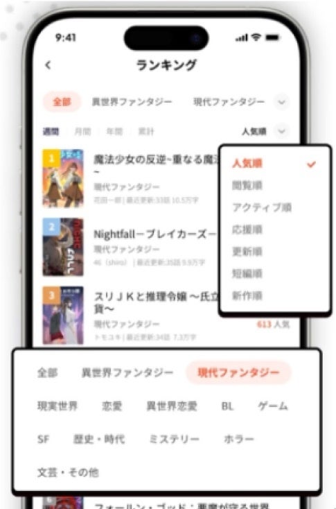 多様化されたジャンル・ランキング ネオページ内の作品は異世界ファンタジー、恋愛などの王道を含めて12の大きなジャンルに分類されます。ジャンルにはそれぞれランキングも設けられており、各ジャンルで注目を集める作品を一目で見ることができます。