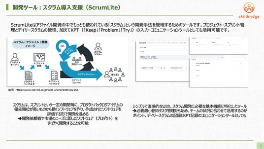 - 人気のアジャイル開発手法・スクラムを導入するための独自ツール「ScrumLite」を提供。
