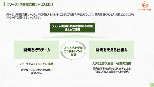 スキルブリッジ株式会社(本社:神奈川県横浜市、代表取締役:佐藤 元輝、以下「当社」)は、スタートアップ経営者や新規事業責任者などを対象に、フリーランスエンジニアの高精度マッチングから開発体制の構築・運用を支援する「フリーランス開発支援サービス」を2024年12月25日より開始いたします。