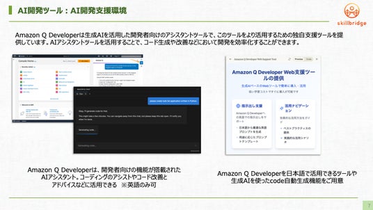 - コーディングや改善のアシストを行う生成AI(Amazon Q Developer)を、日本語環境でも利用しやすい当社独自の支援ツールとセットで提供。