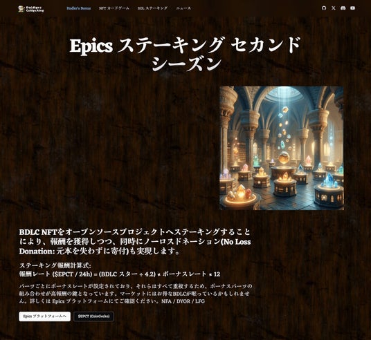 - No-Loss Donation(元本を失わずに寄付)を実現: Epics プラットフォーム上で BDLC をステークすることで EPCT トークン報酬を獲得でき、その同額がステーク先のオープンソースプロジェクトへ寄付されます。