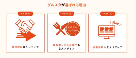 グルスタは、飲食業界専門の求人サービスとして、以下の特長を備えています
