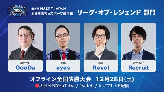NASEF JAPAN/ナセフ ジャパン(理事長:松原 昭博 特定非営利活動法人国際教育eスポーツ連盟ネットワーク 日本本部)は、『第2回 NASEF JAPAN 全日本高校eスポーツ選手権』におけるリーグ・オブ・レジェンド・VALORANT両部門の全国決勝大会を、2024年12月28日(土)、29日(日)の両日開催します。オフライン会場での観戦方法、配信スケジュールをお知らせします。