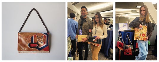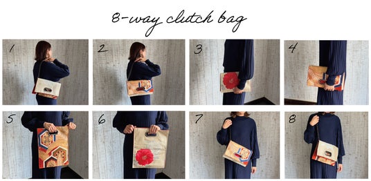 Re:ADY Bの「8-way clutch bag」は、柄の違う帯を2枚使用した、すべてが1点ものの製品です。色や質感、模様の違う生地を両面で使うことによって独自性と使用用途の幅を持たせ、普段使いからパーティーまでさまざまな場面で使用できる規格となっています。すでに海外の展示会「Silicon Valley November Summit 2024」でも市場調査を行っており、大変ご好評をいただいています。