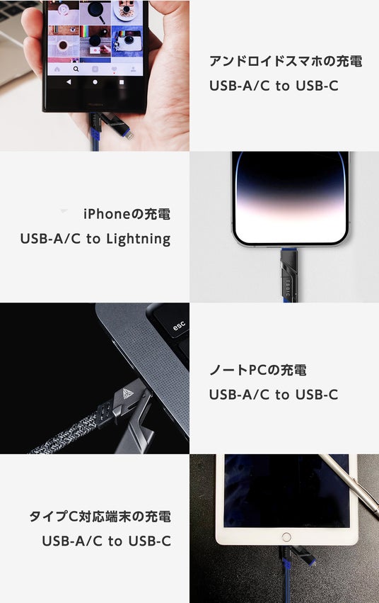 USB-C to USB-Cの100W急速充電から、まだまだLightningを使いたいiPhoneユーザー、外出時にノートPCを使いたいビジネスマンまで、これ1本あればいつでもどこでも対応可能なマルチ充電ケーブルです。