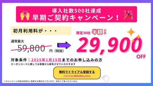 2021年8月のサービスリリース以来、多岐にわたる業種・規模の企業様にご愛顧いただき、順調に導入実績を拡大してまいりました。この度、500社突破を記念し、新規導入ユーザー様向けに初月利用料半額キャンペーンを実施いたします。