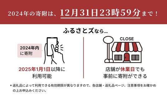 店舗型ふるさと納税(R)『ふるさとズ』なら、年内のご寄附で即時発行される「ご利用券」や「クーポン」は、来年でもご利用いただけます。