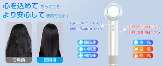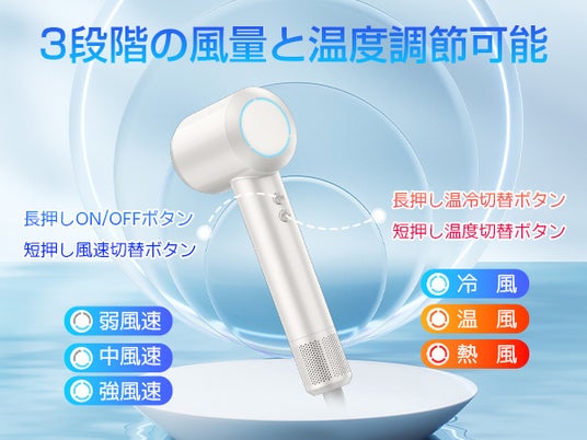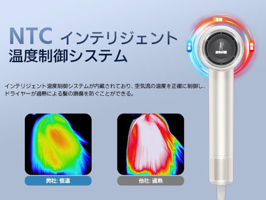 LEDリングの温度表示で、冷風・温風・熱風・冷熱循環の4モードを簡単切り替え。髪質やシーンに合わせた温度管理が可能です。さらに、NTCセンサーによるスマート制御で髪を熱ダメージから守り、サロン級の仕上がりをお届けします。
