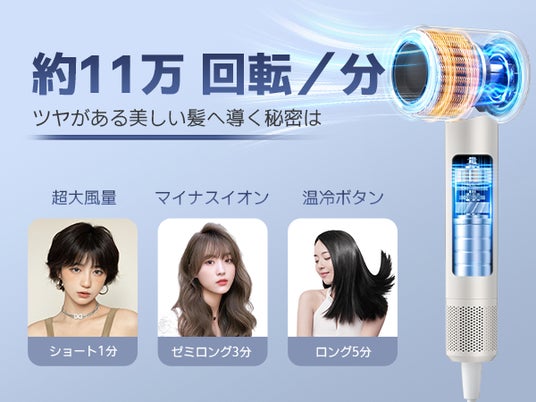 「Alloomドライヤー」は、業界最速クラスの高速ブラシレスモーターを搭載。最大110,000rpmのパワフルな風量で、従来のドライヤーよりも6倍の速さで乾燥を実現。ショートヘアならたった30秒で乾き、忙しい朝やお出かけ前の時間を効率化します。