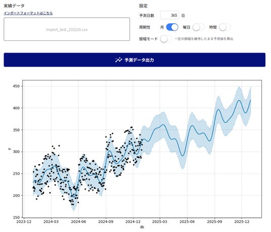 専門的なデータ前処理やプログラミング不要で、簡単に利用することができます。日付・数値データが入力されたCSVファイルがあれば利用できるため、売上予測・在庫予測・需要予測など、多様な指標に対応しております。
