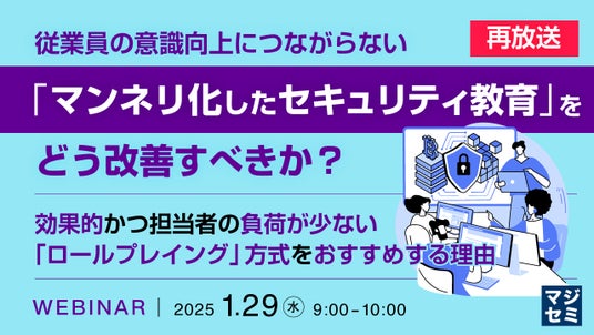 マジセミ株式会社は「【再放送】従業員の意識向上につながらない「マンネリ化したセキュリティ教育」をどう改善すべきか?」というテーマのウェビナーを開催します。