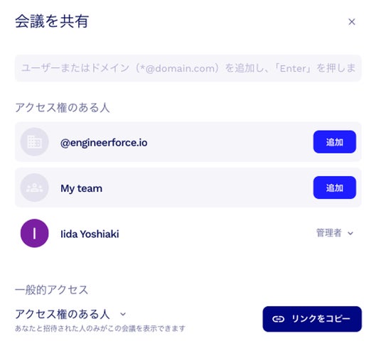 録画内容を共有録画や要約をチームメンバーと簡単に共有。非参加者でも会議の内容を把握可能。: