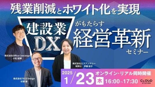 人事労務分野のシステム活用・導入支援を手掛ける株式会社TECO Design(本社:東京都新宿区、代表取締役社長 : 杉野 愼)が運営しているショールーム「CLOUD STATION」にて、『残業削減とホワイト化を実現!建設業DXがもたらす経営革新セミナー』と題し、無料オンラインセミナーを2025年1月23日(木)16:00から開始いたします。