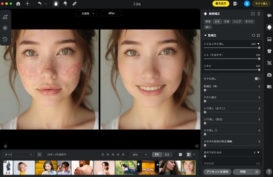 「Evoto」は写真スタジオ・プロフォトグラファー・クリエイターのためのプロ仕様のAIレタッチソフトです。ポートレート写真に特化しており、これまでレタッチャーの経験やスキルに頼っていた部分をAIが代替し、レタッチ効率の向上と品質の安定を実現します。また、業務利用を念頭に開発された独自のAI技術と画像処理技術によって、自然さを失わない処理、高品位印刷に耐える品質で書き出しが可能です。