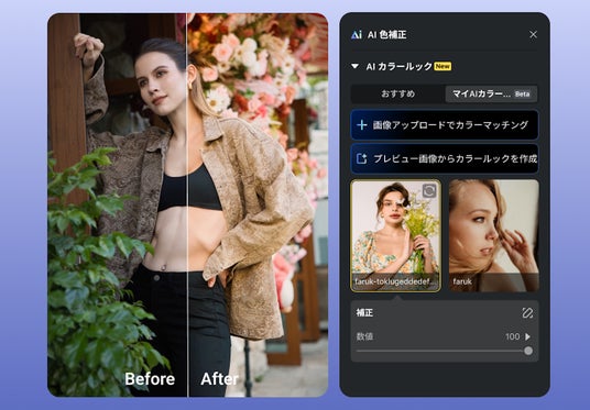 色補正のパラメーターを触ることなく自動で色味を再現できるため、色補正にかかる時間を大幅に短縮できます。これにより、ブライダル写真、成人写真、広告写真などの色補正作業の効率化に貢献します。