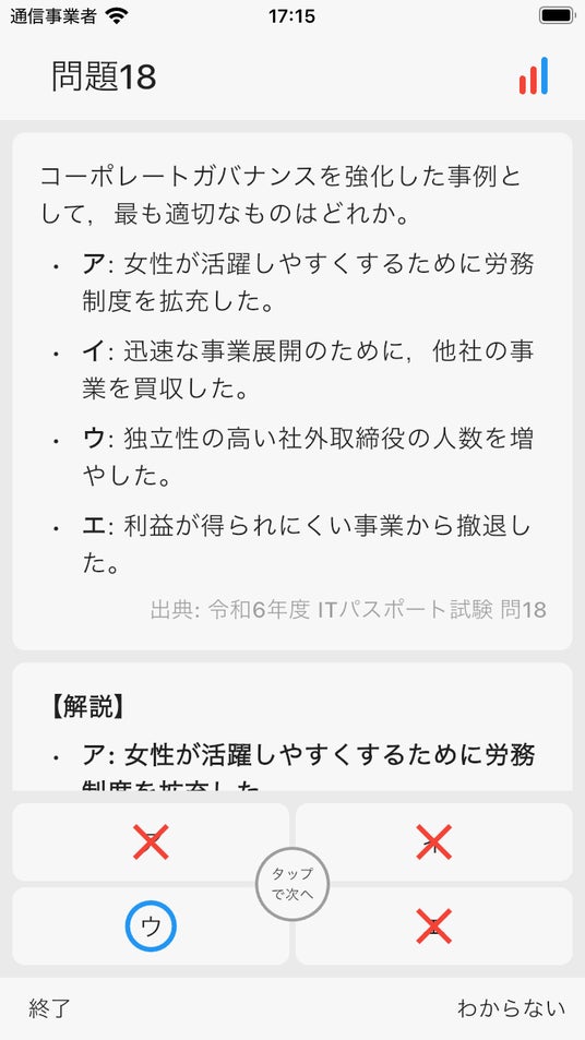 画面UIとして、余計な広告や機能は一切なく、過去出題された問題を解くことに集中することができます。