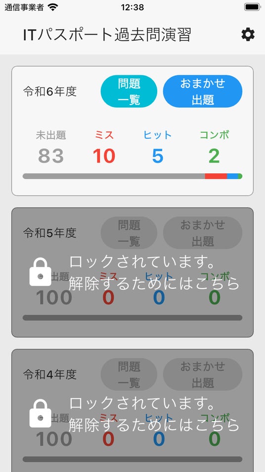 さらに、「未出題(=一度も解いていない)」「ミス(=直前で間違えた)」「ヒット(=直前で正解した)」「コンボ(=直前で2回連続で正解した)」という概念があり、各回ごとに視覚的に分かりやすく表現されているため、どの年度の演習が足りていないか、どれくらいの正答率で答えられたかを簡単に図から判断することが可能です。