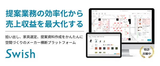 Swish(スウィッシュ)は、空間づくりにおけるメーカー横断のプラットフォームとして、空間提案の業務工数を80%削減するとともに、クオリティの高い空間提案をサポートするシステムです。