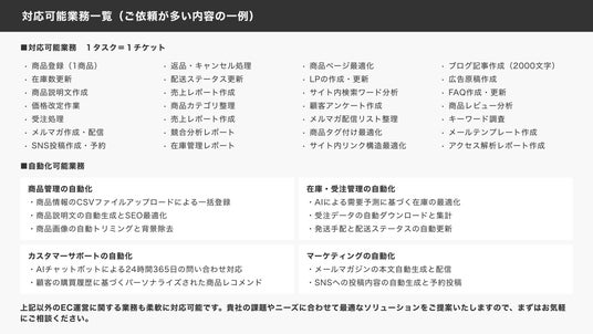少子高齢化による労働力不足、専門知識の不足による機会損失、煩雑な運営業務など、EC事業者が抱える様々な課題に対して、AIを活用した革新的なソリューションと人材をかけ合わせることで、より多くの人々がECビジネスに挑戦できる環境を創造します。