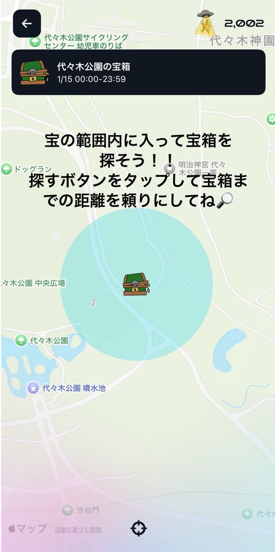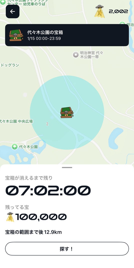 - 宝箱を探そう!マップ上の範囲内に隠された宝箱を見つけ出し、「探す!」ボタンをタップすると、宝箱までの距離が表示されます。距離を頼りに宝を探しましょう!