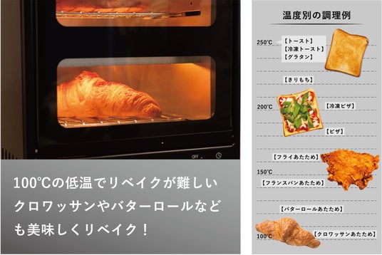 中身が冷たいままだったり焦がしてしまったりなど温度調節が難しい温め直し=リベイクも、自由に温度を設定できることで格段にレベルアップさせてくれます。100℃の低温では、バターを多く含むクロワッサンやバターロールなどリベイクが難しいパンも美味しくリベイク。250℃の高温を使えば、簡単なグリル調理も可能です。