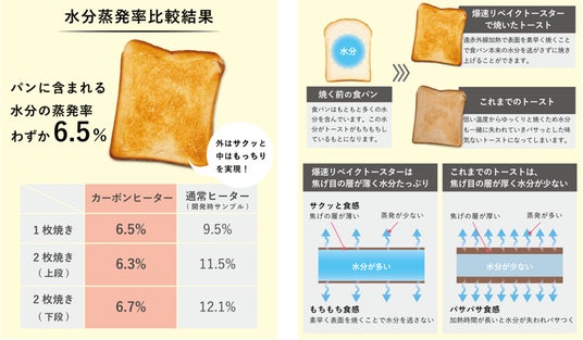 上下方向からの遠赤外線加熱により、パンの水分を逃さず焼き上げ、まるでパン屋の焼きたてパンのような、表面はサクッと、中はふわっとした食感を実現しました。一般的なヒーターと水分蒸発率を比較(※1)しても6.5%~6.7%と圧倒的に抑えられており、火を通すことで失われてしまう水分をしっかり残したまま、素早く、おいしいトーストを焼くことができます。